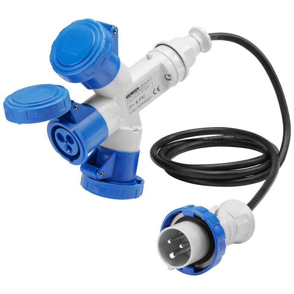 Adaptor industrial 3 căi Gewiss, 16A, 230V, cablu 2m. Rezistent la apă și praf IP67. Comandă acum!