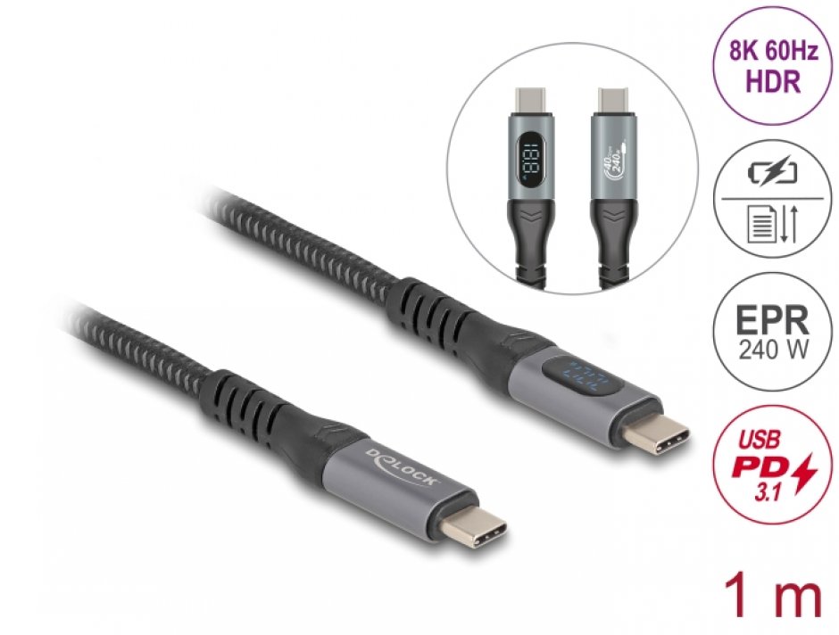 Cablu USB-C Delock 8K60Hz, 240W, PD 3.1 cu afisaj. Comanda acum pentru transfer rapid!