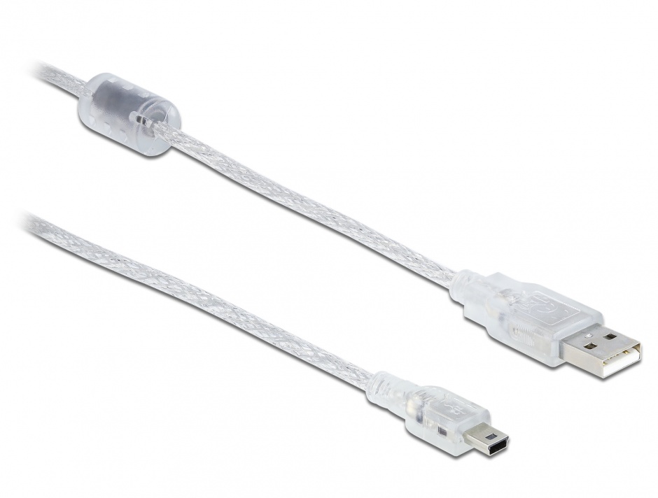 Cumpără Cablu USB la Mini USB-B 2.0 5m transparent de la Delock. Ideal pentru transfer de date și încărcare. Comandă acum la un preț avantajos!