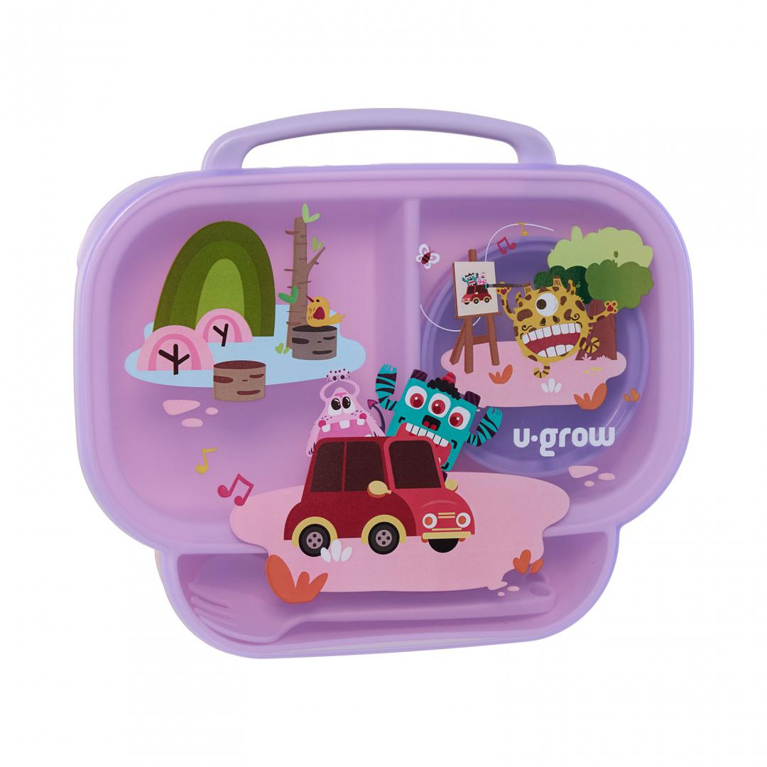 Farfurie compartimentată mov pentru bebeluși de la U-GROW. Set complet cu capac, linguriță și furculiță. Ideală pentru diversificare. Comandă acum!