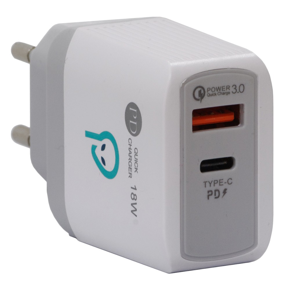 Incarcator retea Spacer 18W cu Quick Charge 3.0 si Power Delivery. Doua porturi USB-C si USB-A pentru incarcare simultana. Design compact, protectii multiple.