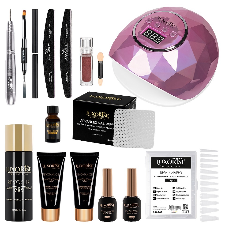 Kit Polygel LUXORISE complet cu lampa 86W, freza si accesorii. Ideal pentru manichiuri rezistente. Comanda acum!