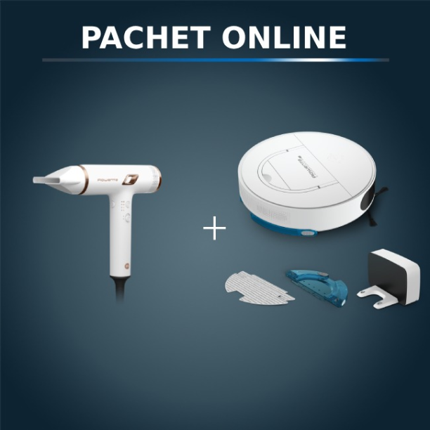 Rowenta pachet promo: Aspirator robot cu AI & uscător de par. Curățenie inteligentă și îngrijire profesională. Comandă acum!