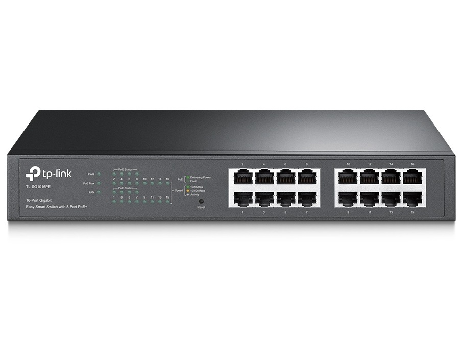 Switch TP-Link TL-SG1016PE cu 8 porturi PoE+ și 110W. Simplifică rețeaua și alimentează dispozitive IP. Comandă acum la preț avantajos!
