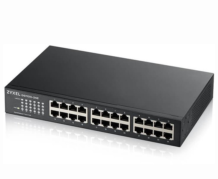 Switch Zyxel GS1100-24E cu 24 porturi Gigabit, plug-and-play, carcasă metalică. Soluție ideală pentru rețeaua ta de acasă sau birou. Comandă acum!