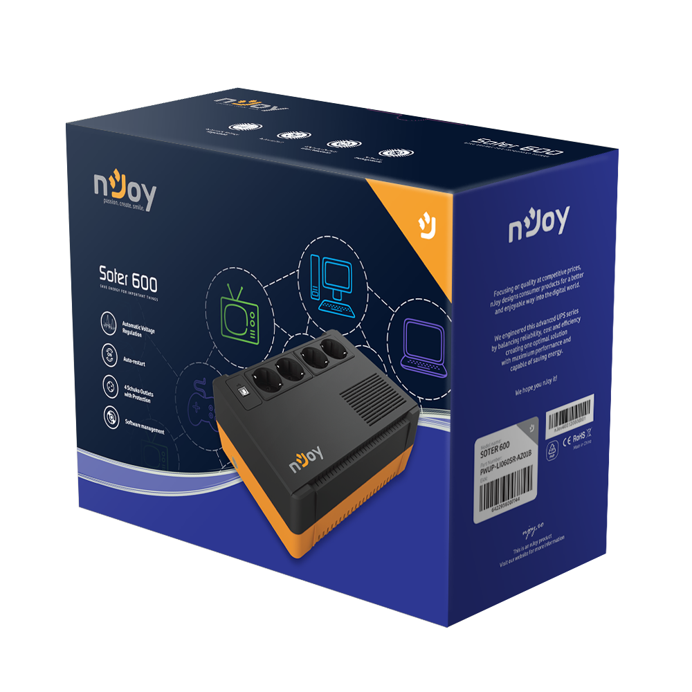 UPS Njoy Soter 600, 600VA/360W cu stabilizator AVR și 4 prize protejate. Protecție sigură pentru echipamente. Comandă acum la preț avantajos!